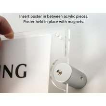 The Clear Acrylic Stand Off Frame can be used as a alternative high end poster frame. The high quality acrylic is crystal clear showing maximum clarity to displayed posters. The frame has magnets embedded into the acrylic holding the poster securely into place. It is secured to the wall by aluminium stand off mounts.
